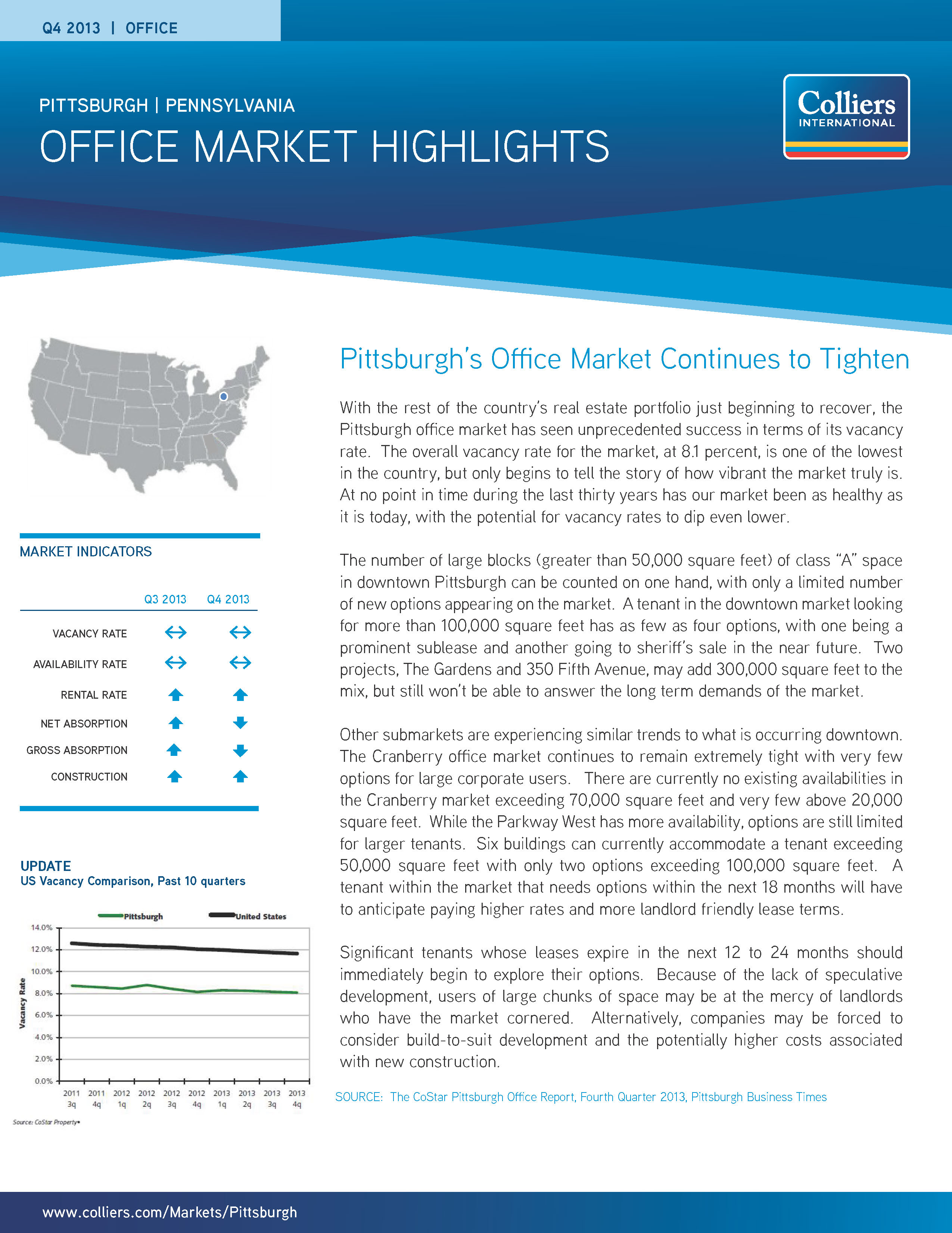 With the rest of the country’s real estate portfolio just beginning to recover, the Pittsburgh office market has seen unprecedented success in terms of its vacancy rate. The overall vacancy rate for the market, at 8.1 percent, is one of the lowest in the country, but only begins to tell the story of how vibrant the market truly is. At no point in time during the last thirty years has our market been as healthy as it is today, with the potential for vacancy rates to dip even lower.