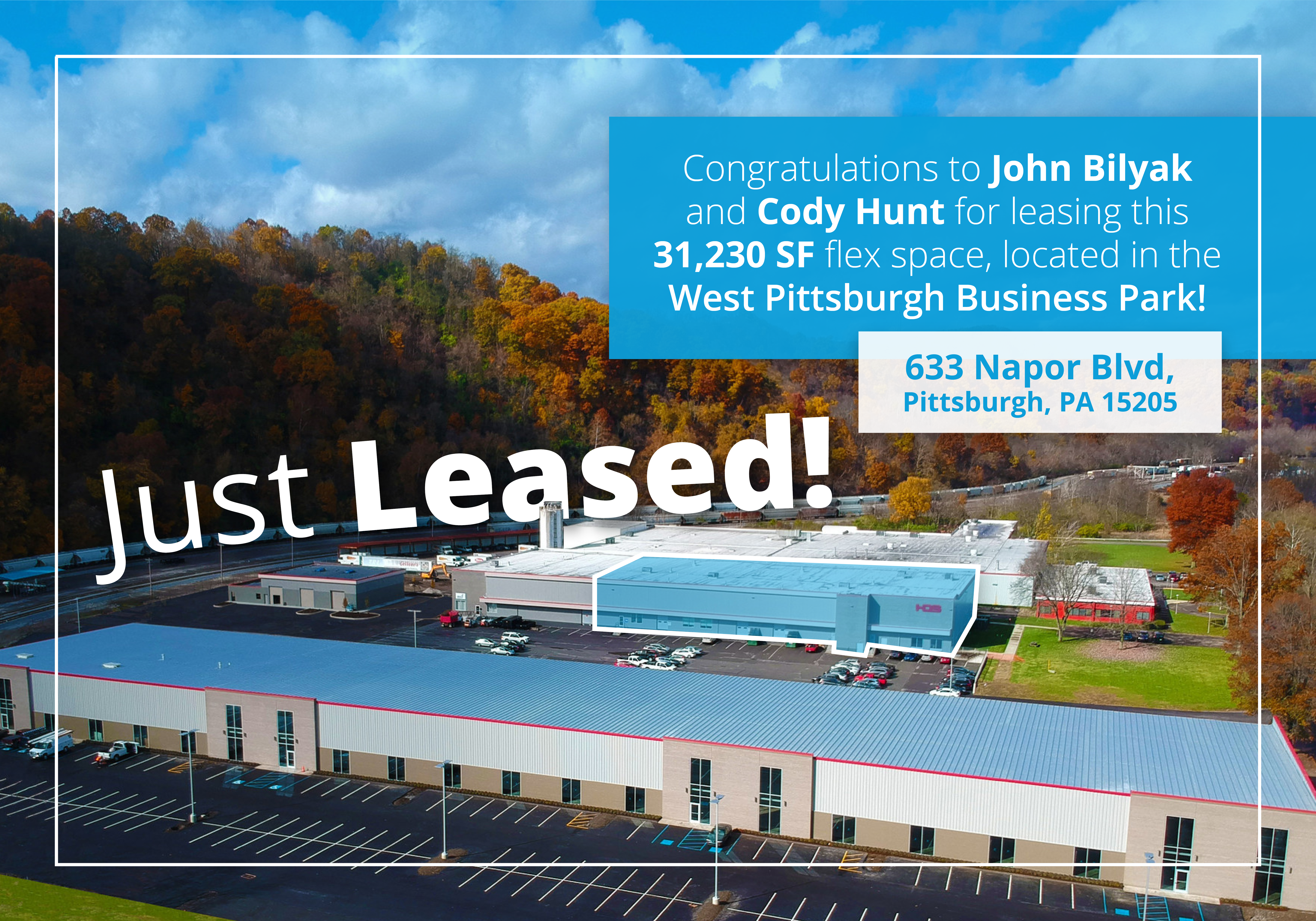 Colliers’ Pittsburgh office is excited to announce that Industrial team members John Bilyak and Cody Hunt recently facilitated a 31,230-square-foot deal at 633 Napor Boulevard in Sampson Morris Group’s West Pittsburgh Business Park: an attractively located, functional flex space located in Pittsburgh’s Parkway West Corridor.