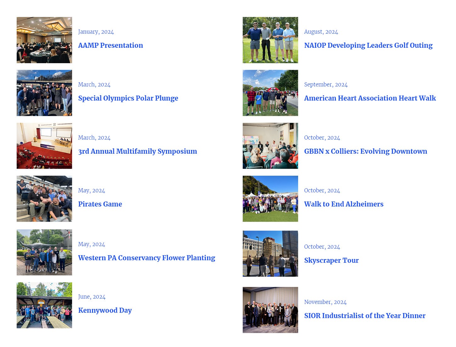 Outside of securing deals, we also invest heavily — pun intended — in our company culture. Between routine morning coffee runs, Flip Flop Friday (regardless of the weather), game nights, and questioning daily why our office is so cold, we truly enjoy experiencing it all together. From hosting our 3rd Annual Multifamily Symposium to riding coasters at Kennywood, jumping in (literally) at the Special Olympics’ PA Polar Plunge fundraiser to group touring downtown’s finest skyscrapers, our office has had a blast experiencing, supporting, and enjoying Pittsburgh all throughout 2024.