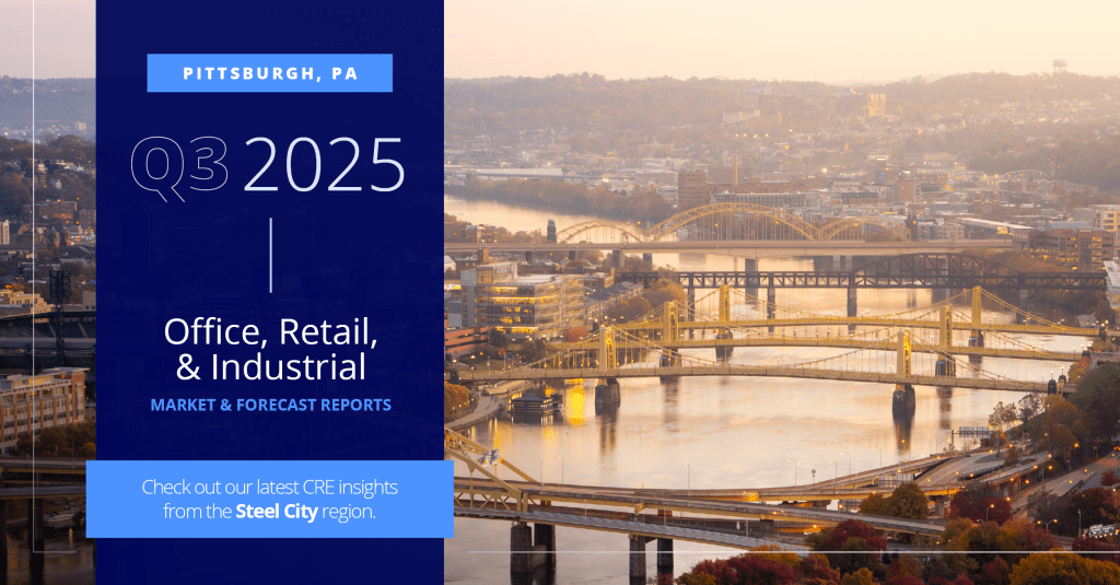 The office market in the Steel City region continues to signal signs of recovery, as steady leasing activity, increasing rental rates, and positive net absorption indicate growing tenant confidence (likely in part due to company mandated RTO strategies). The area’s retail sector threw out some mixed signals in Q3, demonstrating an uptick in vacancy (with notable big box closures partially to blame), but a climb in asking rents and net absorption as well. Pittsburgh’s industrial scene continued to weaken amidst high construction costs and macroeconomic uncertainty, with asking rates and net absorption falling while overall vacancy rose by 0.4%.